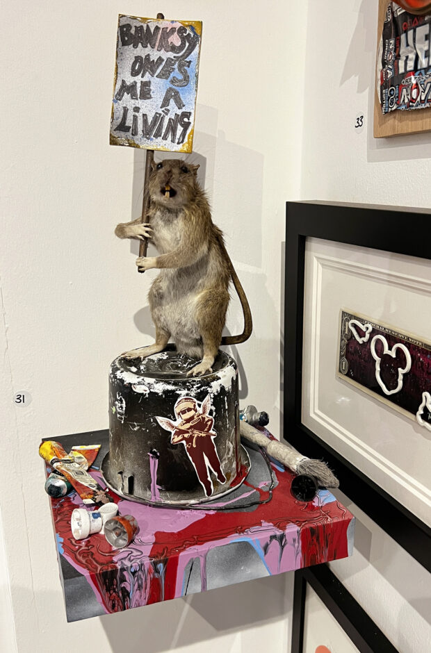 Genuine Protesting BANKSY taxidermied rat on wall mounted shelf with